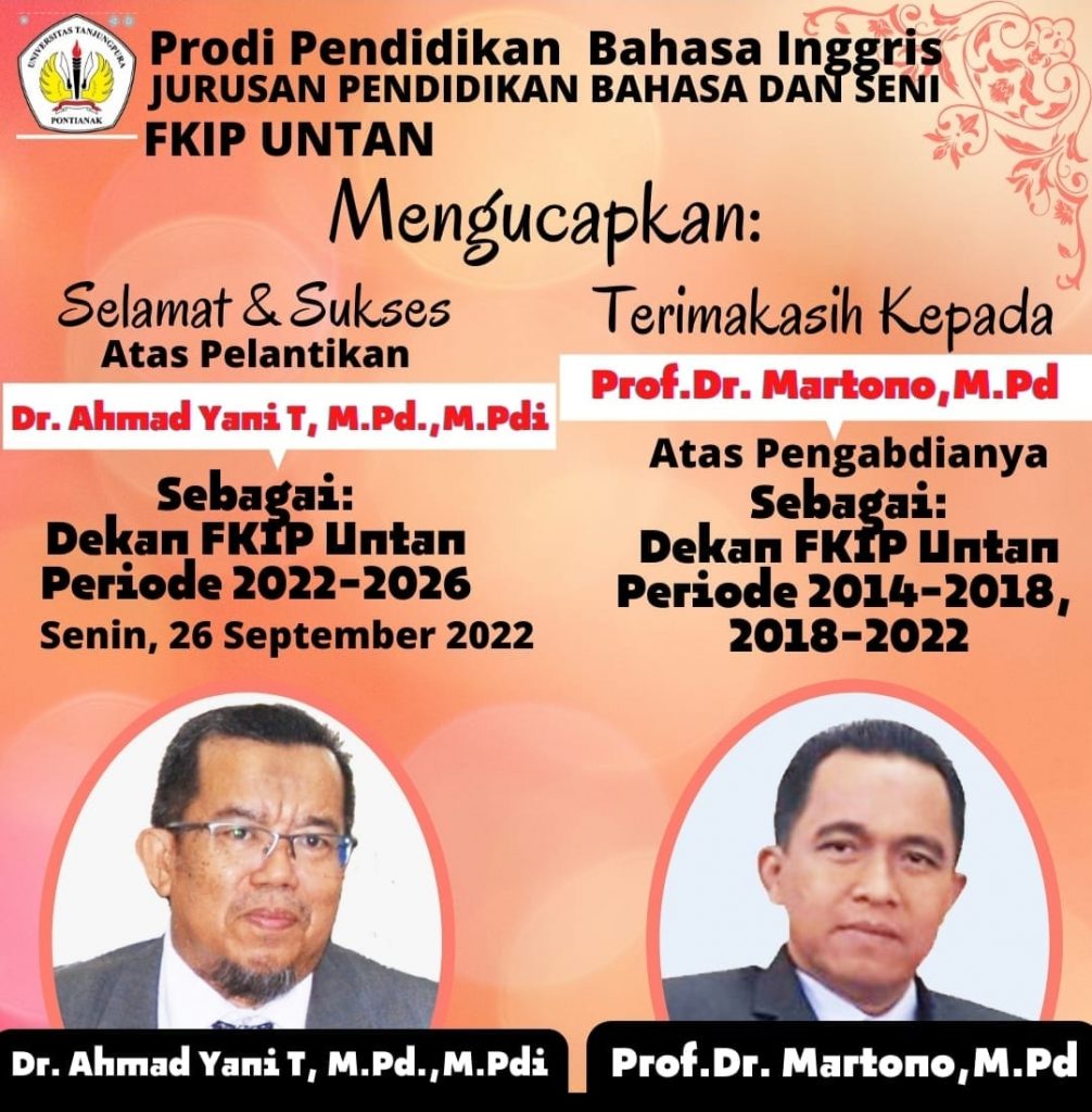 Seluruh Dosen dan Mahasiswa Program Studi Pendidikan Bahasa Inggris FKIP Untan mengucapkan selamat dan Sukses kepada Dr. Ahmad Yani T, M.Pd.,M.Pdi sebagai Dekan terpilih FKIP Untan Periode 2022-2026 yang di lantik hari ini, Selasa 26 September 2022. Seluruh dosen Prodi Read more