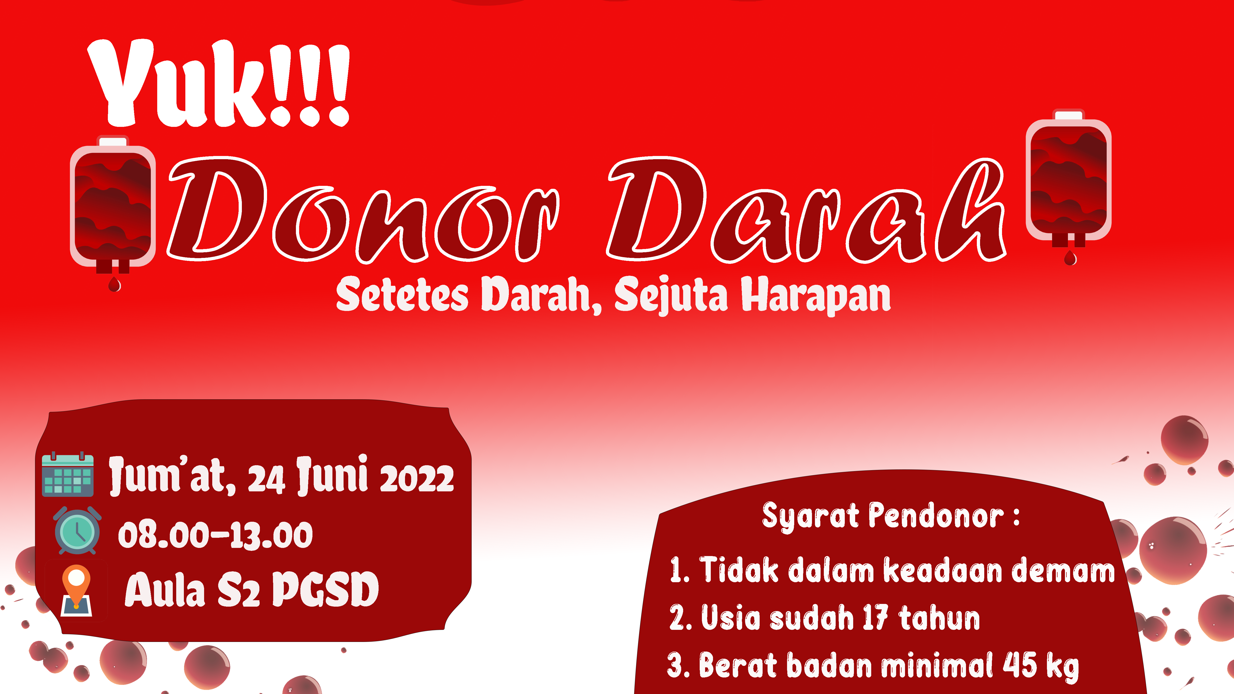 Dalam rangka memperingati Dies Natalis Himpunan Mahasiswa Program Studi Pendidikan Guru Sekolah Dasar, Pengurus Hima PGSD menyelenggarakan kegiatan Donor Darah yang akan dilaksanakan pada tanggal 24 Juni 2022 di Kampus 2 FKIP UNTAN (PGSD), Jl. Karya Bhakti. Kegiatan Donor Darah ini terbuka untuk seluruh mahasiswa Program Studi PGSD dan juga untuk khalayak umum.