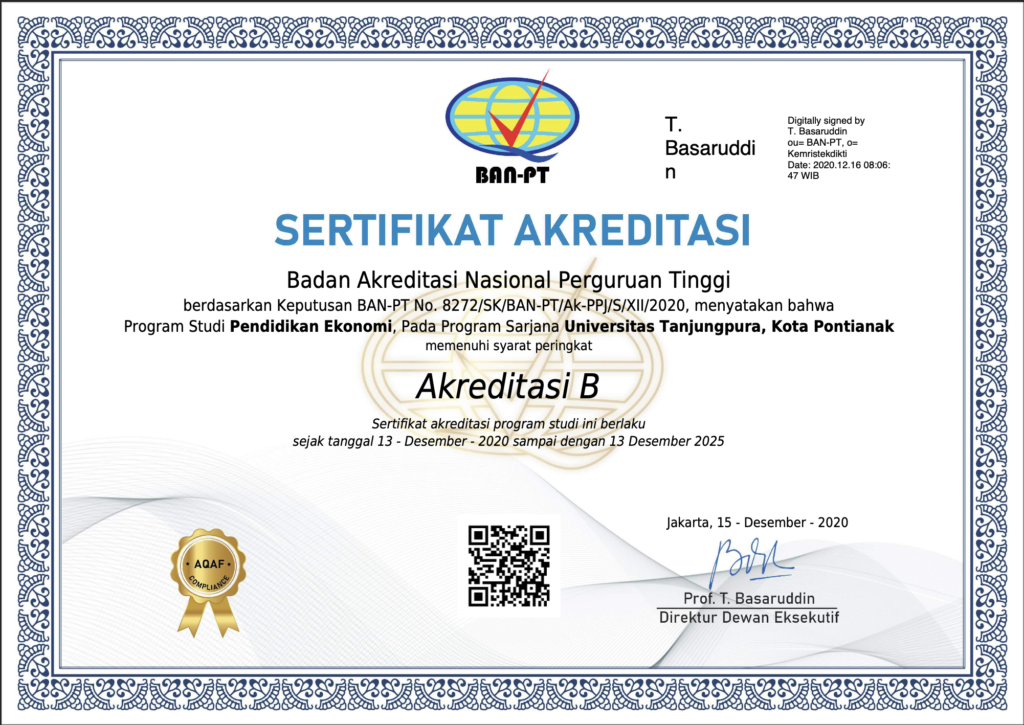 Program Studi Pendidikan Ekonomi Fakultas Keguruan dan Ilmu Pendidikan Universitas Tanjungpura telah Terakreditasi Baik Sekali berdasarkan Surat Keputusan Nomor 8272/SK/BAN-PT/Ak-PPJ/S/XII/2020 dari Badan Akreditasi Nasional Perguruan Tinggi (BAN-PT)