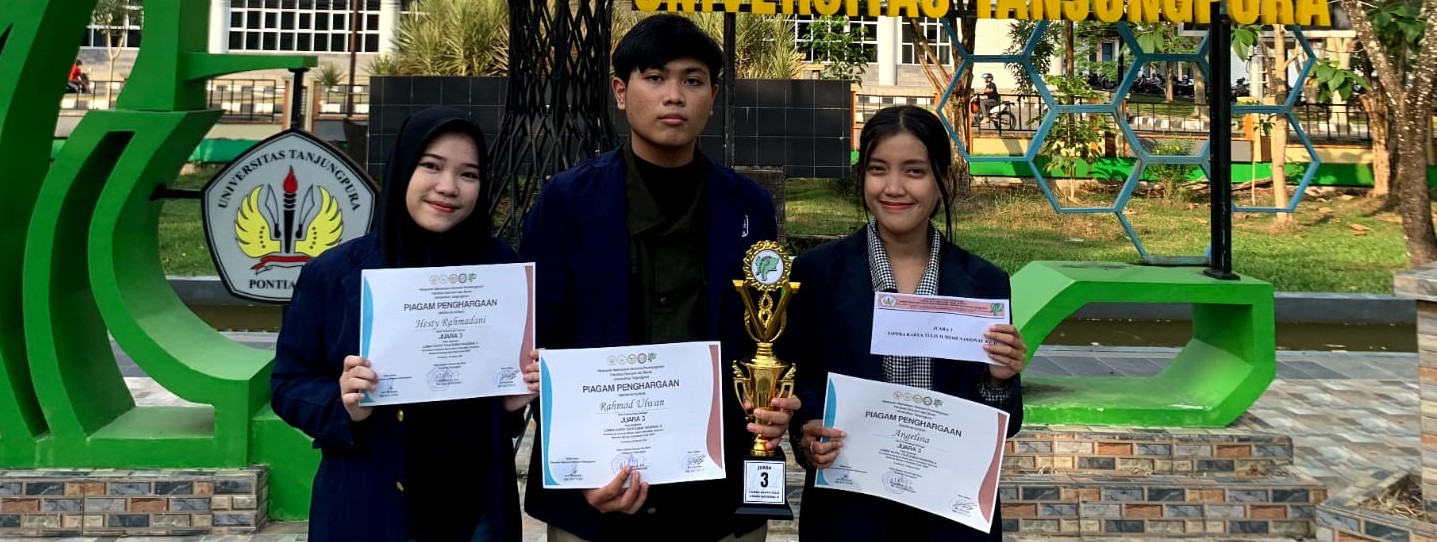 Kabar membanggakan dari tiga mahasiswa hebat yakni: Rahmad Ulwan (Program Studi Pend. Kimia), Angelina (Program Studi PGSD), dan Hesty Rahmadani (Program Studi Manajemen). Mereka bertiga adalah mahasiswa yang mendapatkan juara 3 nasional pada Lomba karya tulis ilmiah Nasional II (LKTIN) HIMEPA FEB 2022. Event ini merupakan Lomba Karya Tulis Ilmiah Tingkat Nasional yang diadakan setiap tahunnya oleh Program Studi S1 Ekonomi Pembangunan, Fakultas Ekonomi dan Bisnis Universitas Tanjungpura. Lomba Karya Tulis Ilmiah Nasional tahun 2022 ini mengusung tema “Kontribusi Generasi Muda dalam Pemulihan Ekonomi Nasional Menuju Indonesia Emas 2045”.
